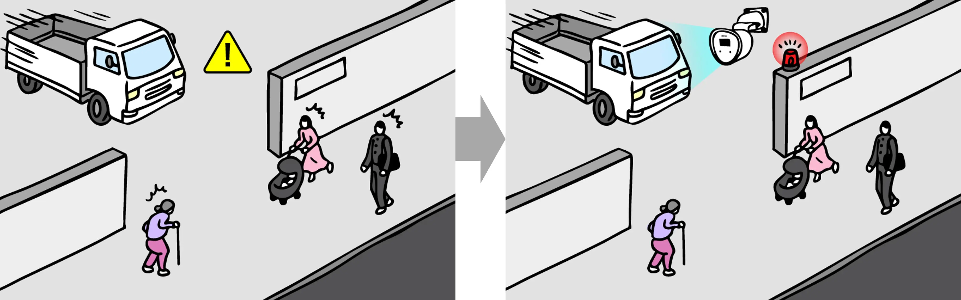 AIは、仕事現場や暮らしをよりよくするだけでなく、わたしたちの安全も守ってくれています。駐車場や、トラックの出入りが多い工場などの施設では、車両の出入口付近の安全確保も大きな課題となります。